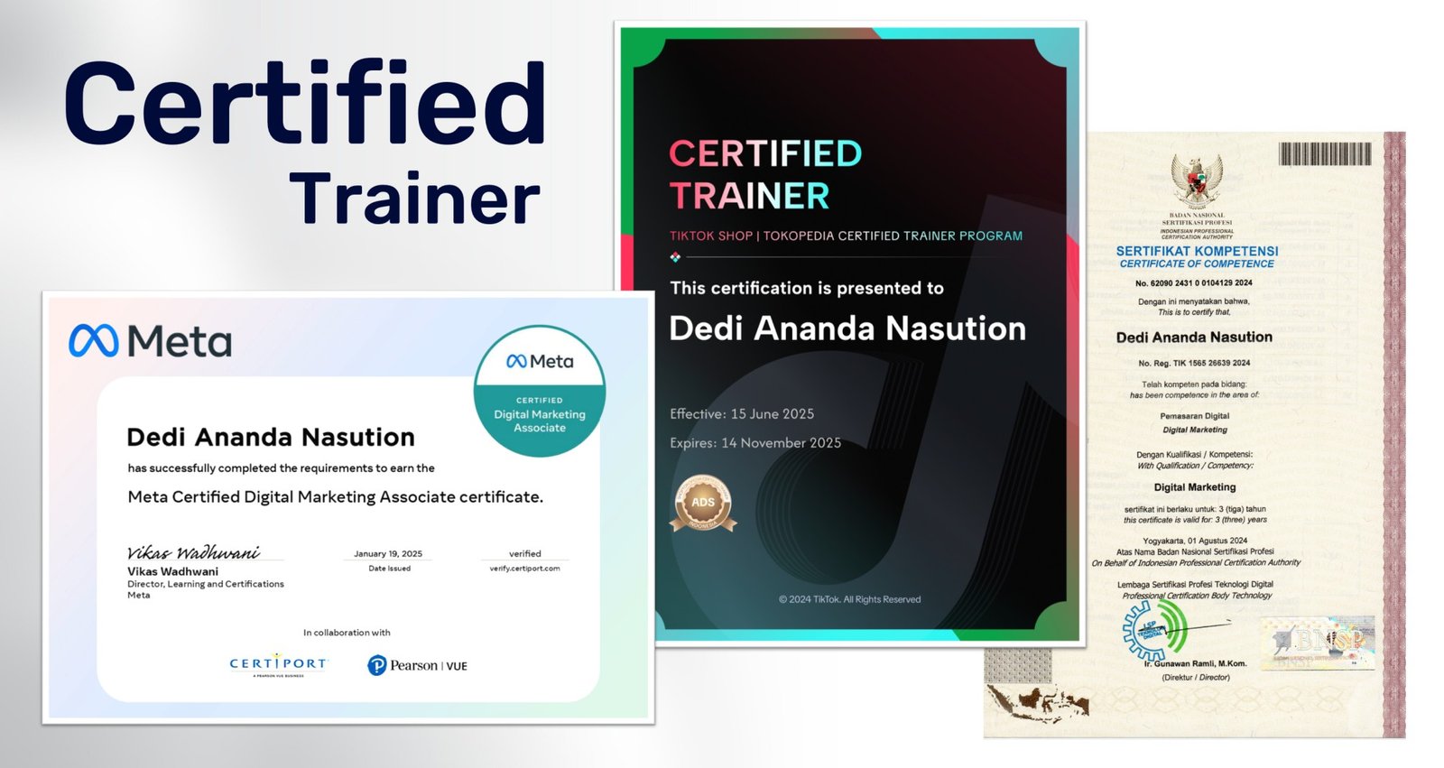 Dengan sertifikasi resmi ini, kami memastikan setiap pelatihan yang kami berikan mengikuti standar internasional, praktis, dan relevan dengan perkembangan terbaru di dunia digital marketing dan desain kreatif